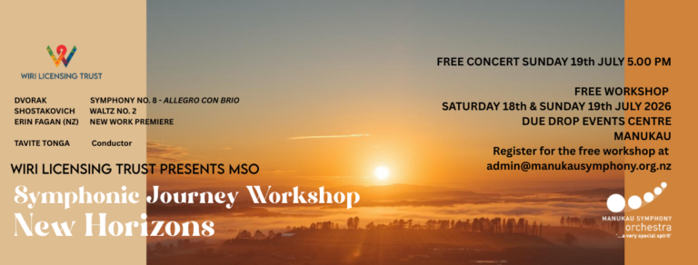 In this year’s Symphonic Journey, young musicians and community players join forces with the Manukau Symphony Orchestra to explore music of joy, elegance, and discovery. Dvořák’s radiant Symphony No. 8 celebrates the song of nature and the optimism of new beginnings; Shostakovich’s graceful Waltz No. 2 brings charm and dance to the concert hall; and New Zealand composer Erin Fagan offers a fresh voice from our own shores. Together, these works open NEW HORIZONS — for the players who learn and grow through music, and for audiences who share in their journey.